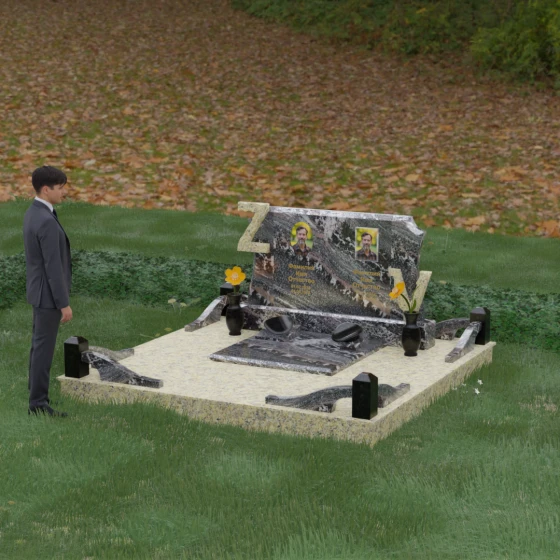 Данная мемориальная композиция включает в себя полное благоустройство участка, что избавляет от необходимости дополнительного оформления. Основанием служит высокий гранитный цоколь, обеспечивающий устойчивость и долговечность всей конструкции. Территория полностью закрыта монолитными надгробными плитами с зеркальной полировкой — это не только придает захоронению величественный вид, но и значительно упрощает уход, предотвращая рост сорной травы и скопление влаги.