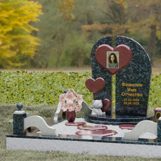 Визуальная концепция модели строится на гармоничном сочетании двух асимметричных вертикальных стел, выполненных из темного камня с безупречной зеркальной полировкой. Центральным элементом композиции является объемное сердце из контрастного красного гранита, которое словно объединяет две половины памятника. В его центре располагается портрет, обрамленный тонкой фаской, что создает эффект драгоценного медальона. Дополнительный акцент вносит второе, меньшее по размеру сердце, закрепленное на левой части стелы, что добавляет динамики и многослойности художественному образу.