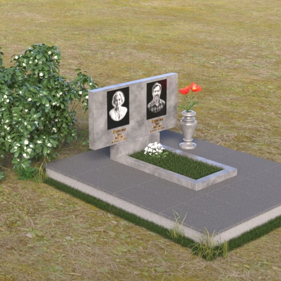 Представленный памятник (артикул ПГ001) являет собой образец строгости и лаконичности, где каждая деталь подчинена общей концепции увековечивания памяти. Композиция состоит из основания, облицованного серыми плитами, горизонтальной плиты, и вертикальной плиты с портретами. Дополнительно предусмотрена тумба для вазы.