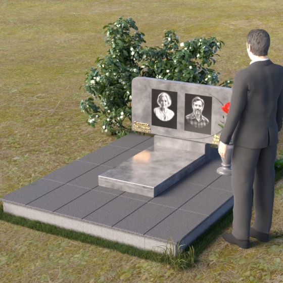 Форма стелы этого ритуального изделия идеально подходит для размещения двух портретов. Композиция с двумя изображениями, выполненными в технике гравировки, выглядит гармонично и сбалансированно. Под портретами можно расположить надпись с именем, датами жизни и короткой эпитафией. Золотое тиснение букв на черном граните создает эффект контраста и придает тексту дополнительную выразительность. Небольшая тумба, расположенная под стелой, служит подставкой для плиты с именами и годами жизни. Рядом с памятником можно установить вазу для цветов, выполненную в том же стиле и из того же материала, что и сам памятник. Это создаст единый ансамбль и подчеркнет целостность композиции. Дополнительно можно установить лампаду или небольшой фонарь, которые будут освещать памятник в темное время суток, создавая атмосферу умиротворения и светлой памяти.