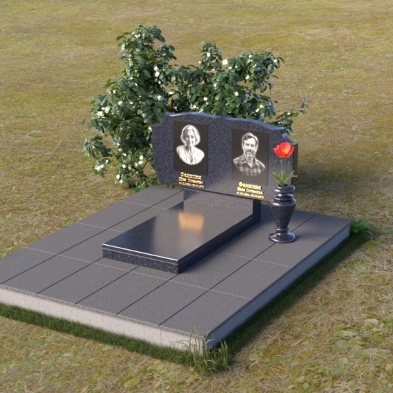 Композиция монумента строится на контрасте плавных линий и строгих геометрических форм. Верхняя часть, несущая на себе портреты усопших, имеет форму, напоминающую раскрытую книгу или свиток, где каждая страница хранит историю жизни. Края этого "свитка" искусно обработаны: верхняя грань словно оплавлена временем, приобретая мягкие, неровные очертания, а боковые стороны имеют более четкий, но все же сглаженный профиль. Фаска, идущая по периметру, придает верхней части визуальную легкость, отделяя ее от основания. Нижняя часть представляет собой прямоугольную плиту с зеркальной полировкой, отражающей небо и окружающий мир, создавая эффект бесконечности и связи с ушедшим. Она словно портал, соединяющий мир живых и мир мертвых, напоминая о непрерывности бытия. Боковины плиты имеют четкую геометрию, подчеркивая основательность и незыблемость памяти.