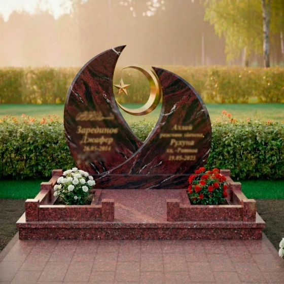Модель ПН 157 представляет собой истинное произведение искусства, воплощенное в камне, призванное стать вечным символом памяти и уважения. Величественная стела, выполненная в глубоком черном цвете, мгновенно притягивает взгляд своей необычной, но гармоничной формой. Ее силуэт напоминает два полумесяца, обращенных друг к другу, создавая динамичную композицию, которая символизирует единство и бесконечность. В центре этой дуальности, словно небесное светило, парит золотистый полумесяц, в объятиях которого покоится изящная пятиконечная звезда. Этот центральный элемент выполнен с ювелирной точностью, его отполированная до зеркального блеска поверхность отражает свет, создавая ощущение невесомости и духовности. Грани стелы тщательно обработаны, демонстрируя безупречную гладкость и плавные переходы, которые подчеркивают естественную красоту камня. Зеркальная полировка черного гранита создает эффект глубокого космоса, в котором каждый луч света играет и преломляется, обещая сохранить свой первозданный блеск на столетия, неподвластный времени и стихиям.