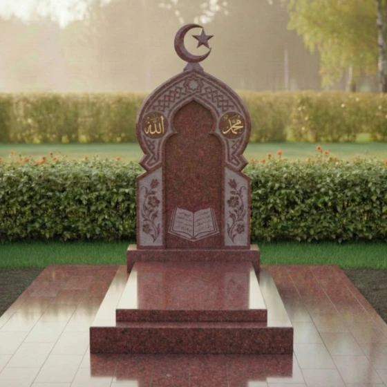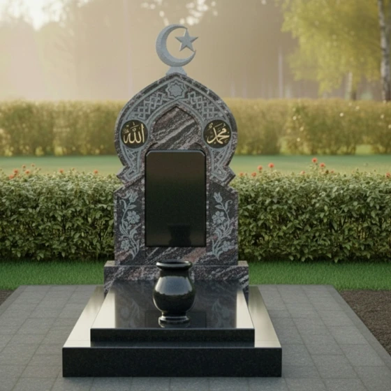 Ритуальное изделие артикула ПН 510 представляет собой глубокое художественное осмысление вечности и памяти, воплощенное в камне. Это не просто надгробие, а целая архитектурная форма, призванная стать молчаливым свидетельством уважения и любви. Центральная стела, выполненная в глубоком черном цвете, символизирует безмятежность и покой, а ее очертания напоминают величественный вход в священное пространство. Верхняя часть стелы увенчана исламским полумесяцем со звездой, выполненным из светлого камня, что создает выразительный контраст и придает композиции духовную значимость.