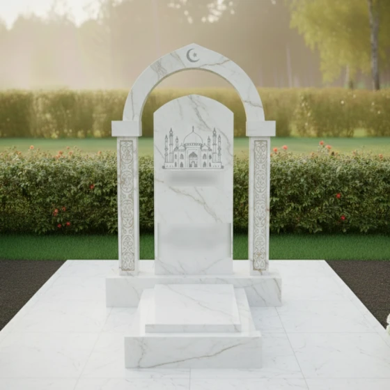 Центральным элементом ансамбля выступает величественная арка, увенчанная символами веры — полумесяцем и звездой. Округлая форма свода, выполненная с безупречной точностью, символизирует небесный купол и бесконечность бытия. Плавные изгибы верхней части композиции, переходящие от высокого навершия к мягко скругленным граням центральной плиты, олицетворяют завершение земного пути и обретение вечного умиротворения. Внутри арки расположена мемориальная плита, на которой методом художественной резки нанесен детализированный силуэт мечети. Тончайшая работа мастеров позволяет увидеть каждый купол и минарет, создавая эффект объема и торжественности.