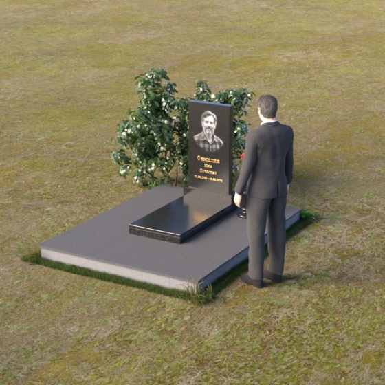 Мемориальная композиция представляет собой вертикальную стелу, выполненную в строгой прямоугольной форме, символизирующей стойкость и незыблемость памяти. Верхняя часть стелы, с ее четкими гранями, словно устремлена ввысь, к небесам, напоминая о духовной составляющей человеческой жизни. Боковые грани стелы обработаны с особой тщательностью, создавая эффект благородной сдержанности. Фаска, аккуратно снятая по периметру, придает изделию завершенный и элегантный вид. Горизонтальная плита, расположенная перед стелой, выполнена в зеркальной полировке, отражая небо и окружающий мир, символизируя продолжение жизни и связь с ушедшим.