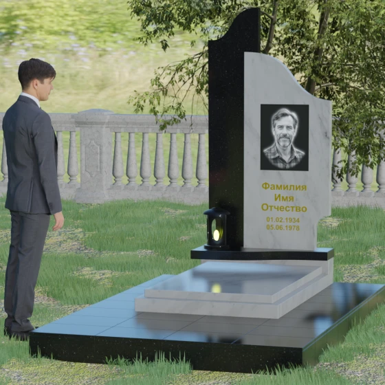Данная мемориальная композиция представляет собой сложный архитектурный ансамбль, в основе которого лежит игра геометрических форм и контрастных фактур. Основная стела состоит из двух вертикальных элементов разной высоты и конфигурации, что создает динамичный и в то же время уравновешенный силуэт. Левая часть стелы выполнена с мягким, волнообразным изгибом, напоминающим спокойное течение времени или уходящий за горизонт путь. Правая часть — более высокая, узкая и статная, с асимметричным «рваным» навершием, которое символизирует возвышенность духа и незыблемость памяти. Такое сочетание плавности и резкости делает это надгробие из натурального камня универсальным решением, способным передать как нежность утраты, так и твердость характера ушедшего человека.