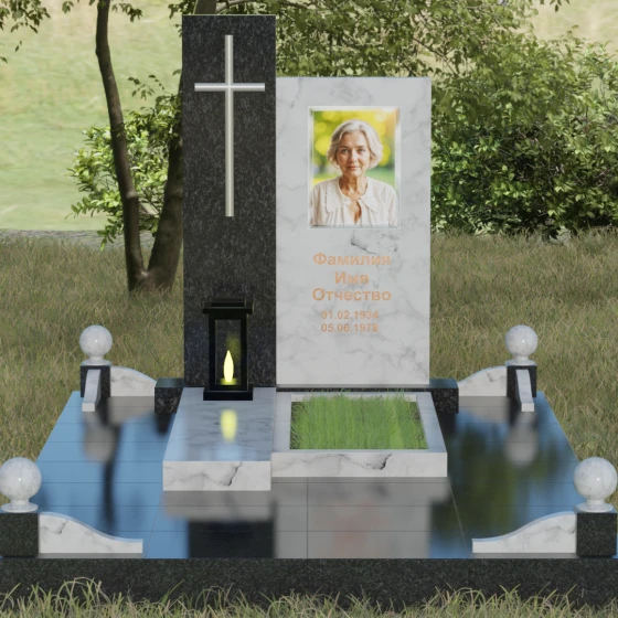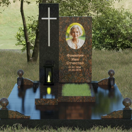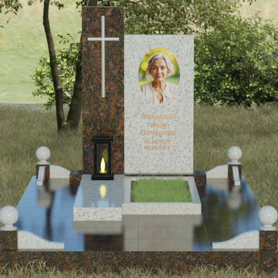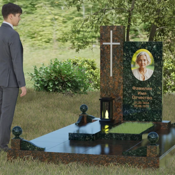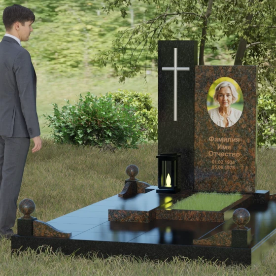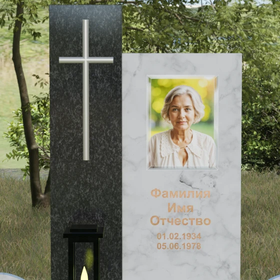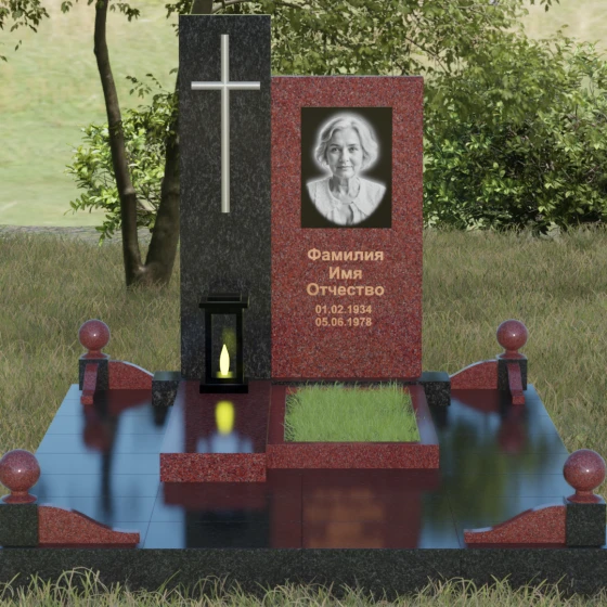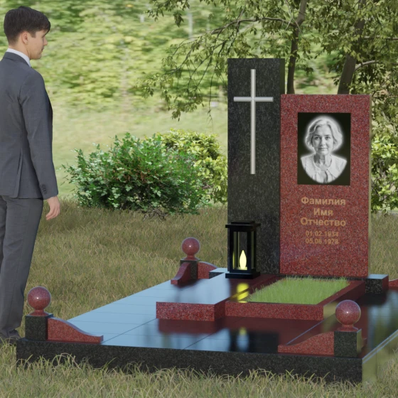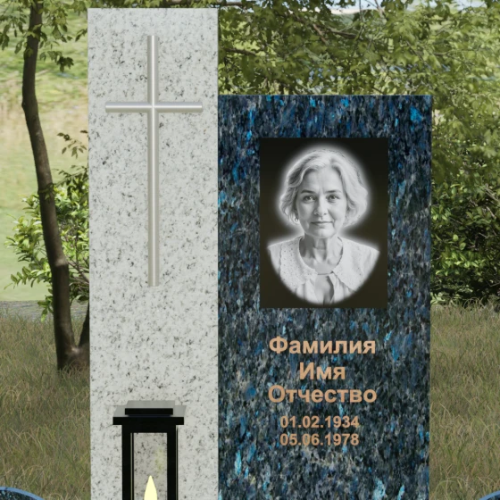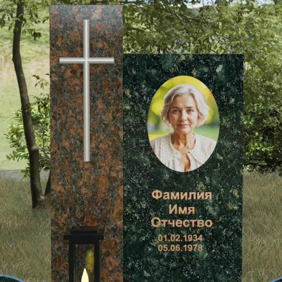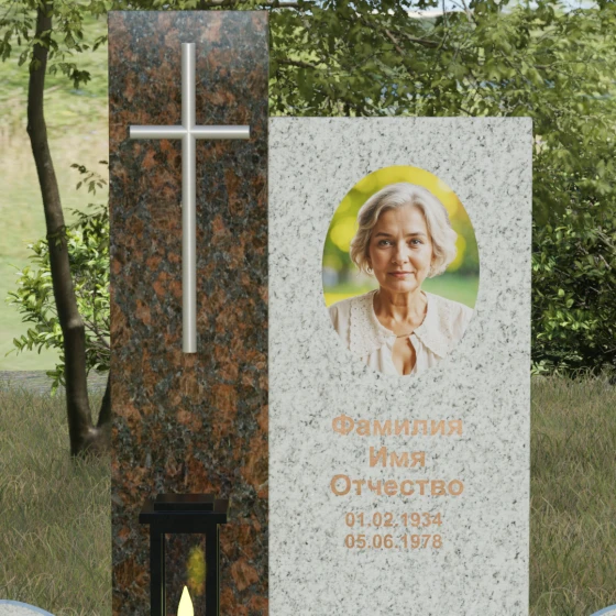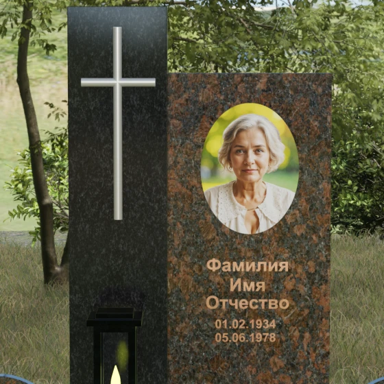 Центральным элементом выступает вертикальная стела, состоящая из двух контрастных блоков, символизирующих дуальность бытия. Левая часть композиции выполнена в виде высокого узкого пилона из насыщенного цветного гранита. На его фронтальной стороне закреплен лаконичный четырехконечный крест с благородным металлическим напылением. Отсутствие лишнего декора на кресте подчеркивает торжественность и строгость момента. Правое крыло стелы — более широкое и основательное — служит идеальным полотном для нанесения портрета и эпитафии. Контраст между глубоким темным оттенком основной плиты и ярким акцентом левой части создает динамику, притягивающую взгляд, но сохраняющую общее настроение светлой грусти.