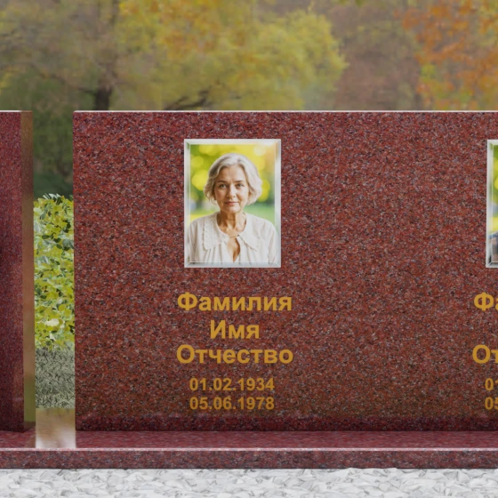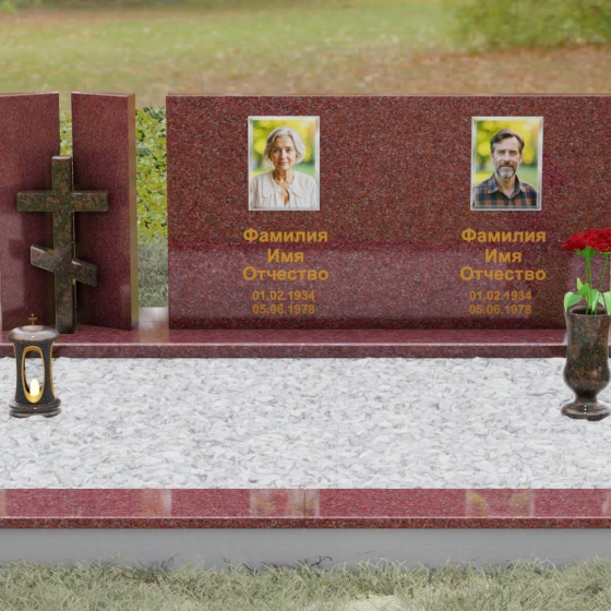 Оформление: Учитывая внушительную площадь горизонтальной поверхности, для этой формы идеально подходит классическая лазерная гравировка портретов. Если же вы выбрали цветной камень (например, Мансуровский гранит или мрамор Тассо), мы рекомендуем установку цветных фотокерамических портретов в овальных или прямоугольных нишах. ФИО и даты жизни лучше всего смотрятся в глубокой вырубке с последующим покрытием сусальным золотом или контрастной художественной краской — это обеспечит читаемость надписей даже с большого расстояния.
