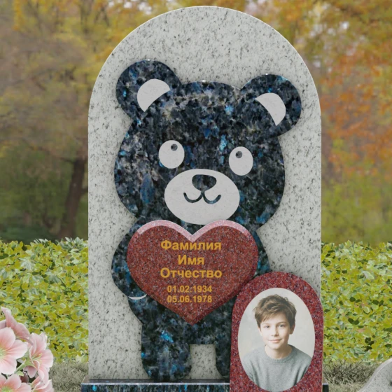 Данная мемориальная композиция представляет собой уникальное сочетание трогательной нежности и величественной непоколебимости камня. В центре художественного замысла лежит глубокий символизм: фигура медвежонка, бережно держащего в лапах сердце, олицетворяет чистоту, бесконечную родительскую любовь и защиту, которую близкие стремятся подарить даже после ухода дорогого человека. Это надгробие из натурального камня выполнено в технике художественного комбинирования различных пород, что создает потрясающий визуальный объем. Массивная светлая стела с полукруглым завершением служит идеальным фоном для темного силуэта, вырезанного с ювелирной точностью. Игра контрастов между зеркальной полировкой черного камня и благородной текстурой светлого гранита подчеркивает каждую деталь: от доброго взгляда лесного покровителя до мягких контуров его фигуры.