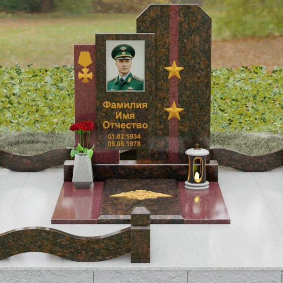 Выбор мемориального комплекса — это всегда поиск баланса между строгостью формы и глубиной чувств. Модель Артикул 201 представляет собой сложную архитектурную композицию, которая идеально подходит для увековечивания памяти сильного, волевого человека, посвятившего жизнь служению. Надгробие из натурального камня состоит из трех вертикальных элементов, создающих динамичный, ступенчатый силуэт. Центральная стела, предназначенная для размещения портрета и основной информации, обрамлена боковыми пилонами из контрастного красного гранита. Такая геометрия символизирует устойчивость, надежную опору и непоколебимость духа. Сочетание строгих прямых линий и аккуратных фасок на вершинах придает памятнику торжественный, парадный вид, подчеркивая заслуги и особый статус усопшего.