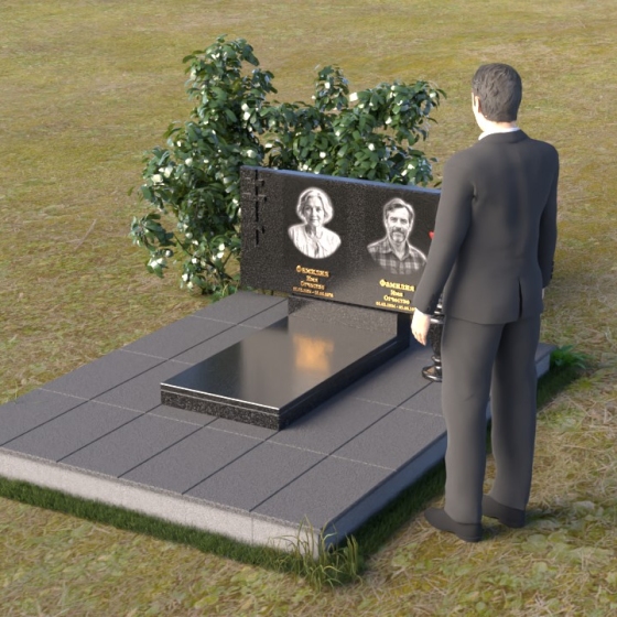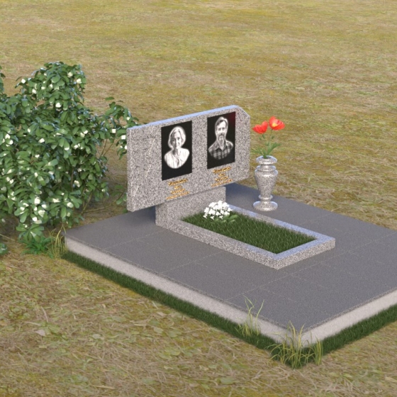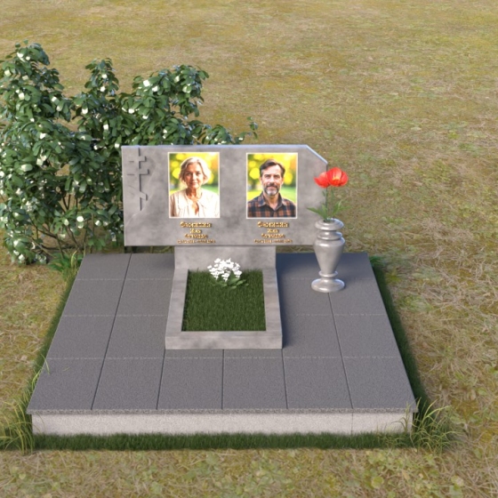 В верхней части памятника располагается вертикальная стела прямоугольной формы с небольшими скошенными углами, придающими ей более мягкий и благородный вид. На поверхности стелы размещены два портрета усопших, выполненные с высокой детализацией. В левом верхнем углу вырезано изображение православного креста, выполненного в лаконичном стиле, подчеркивающем сдержанность и глубину веры. Справа от портретов вырезана изящная роза с детально проработанными лепестками, символизирующая любовь и вечную память. Нижняя часть стелы плавно переходит в горизонтальную плиту, на которой размещается табличка с именами и датами жизни усопших. Горизонтальная плита, в свою очередь, опирается на строгий постамент, обеспечивающий устойчивость всей конструкции.