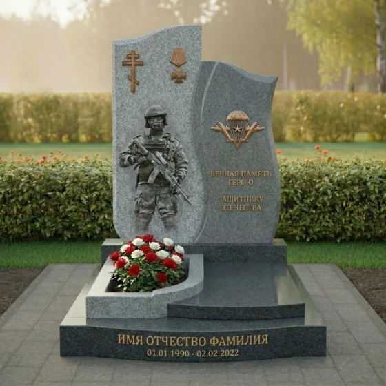 Мемориальная композиция ПН 180 представляет собой гармоничное сочетание двух вертикальных стел, выполненных в едином, но при этом контрастном стиле. Левая стела, более массивная и высокая, имеет строгую прямоугольную форму с плавно скругленными верхними углами, что придает ей монументальность, но без излишней резкости. Ее лицевая часть отполирована до зеркального блеска, отражая окружающий мир и создавая ощущение глубины. На этой стеле, в верхней части, выгравирован лаконичный православный крест, выполненный в классическом стиле, как символ веры и покоя. Ниже креста расположена рельефная гравировка медали, что подчеркивает заслуги и доблесть ушедшего. Центральное место на этой стеле занимает объемный барельеф, изображающий военнослужащего в полном обмундировании, с оружием в руках. Эта фигура выполнена с невероятной детализацией: видны складки на форме, элементы экипировки, выражение решимости на лице. Барельеф имеет матовую, шероховатую фактуру, которая контрастирует с глянцевой поверхностью стелы, создавая эффект объема и выделяя образ героя.