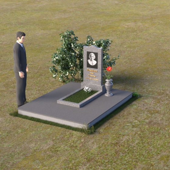 Величественная стела памятника ПВ 008 представляет собой элегантное сочетание строгих линий и плавных изгибов. Верхняя часть стелы имеет волнообразную форму, смягчающую строгость камня и придающую ей утонченность. Грани стелы тщательно отполированы до зеркального блеска, отражая свет и создавая ощущение легкости и воздушности. На лицевой стороне стелы размещен портрет усопшего, выполненный методом гравировки. Ниже располагаются надпись с именем и датами жизни. Под стелой расположена горизонтальная плита, также выполненная из полированного гранита. Ее строгие прямоугольные формы контрастируют с плавными линиями стелы, подчеркивая ее выразительность. Фаски по периметру плиты смягчают углы и придают ей завершенный вид. Рядом со стелой установлена небольшая ваза из темного гранита с изящным орнаментом, предназначенная для живых цветов.