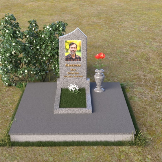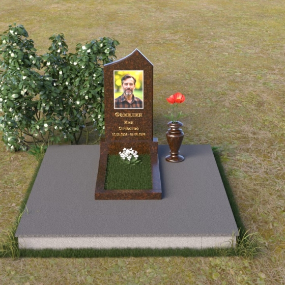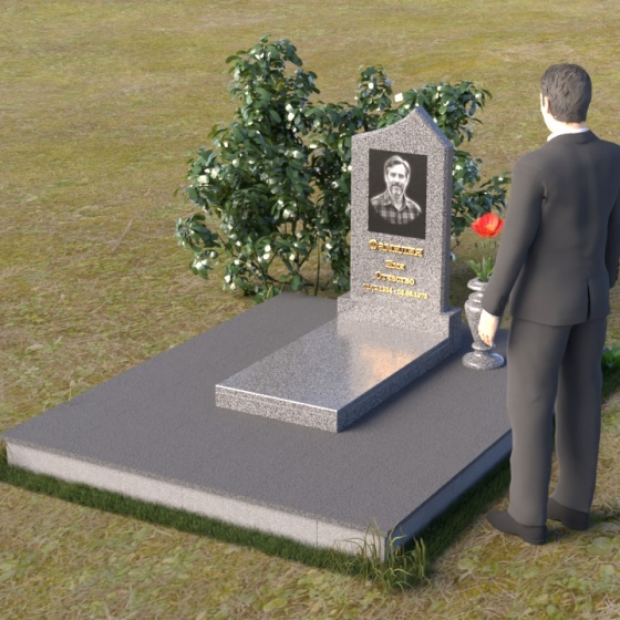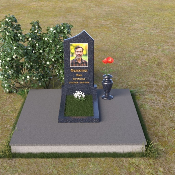 Основание памятника выполнено в виде массивной плиты, обеспечивающей устойчивость всей конструкции. На плите располагается горизонтальная надгробная плита, также выполненная из полированного черного гранита. Она служит местом для цветов, свечей и других памятных вещей. С правой стороны от стелы предусмотрено место для установки вазы. Ваза, выполненная в классическом стиле, гармонично дополняет общую композицию. Она имеет плавные, изогнутые линии и подчеркивает торжественность момента.