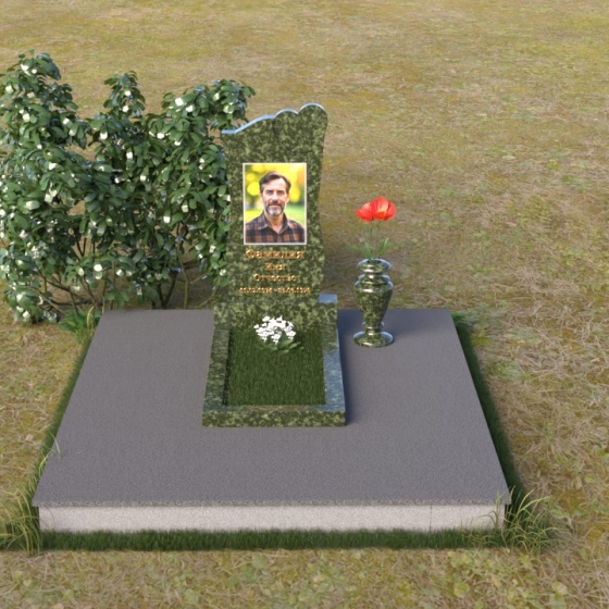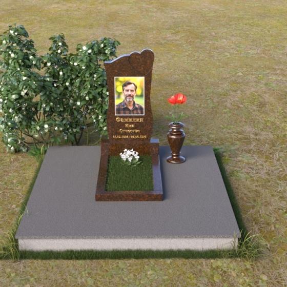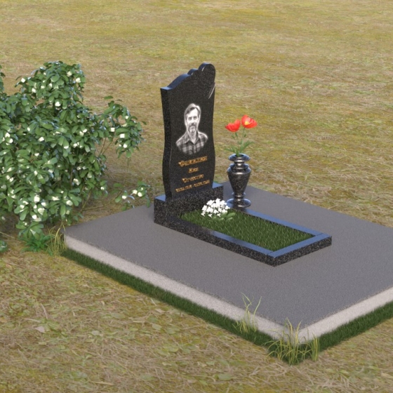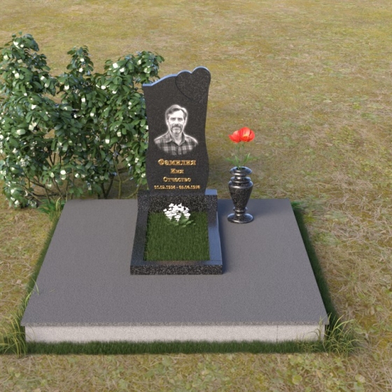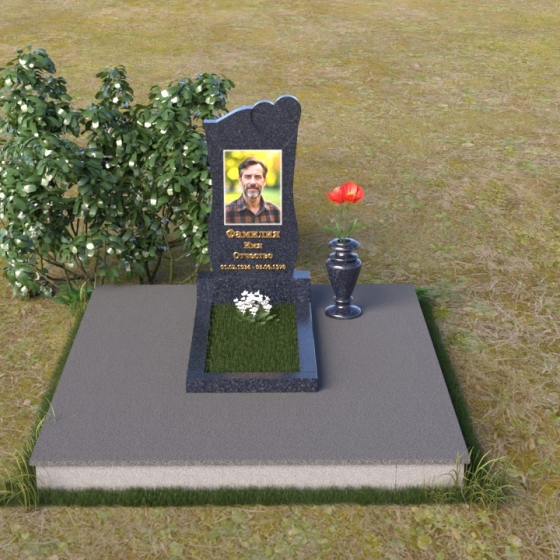 На отполированной поверхности стелы идеально разместится портрет усопшего, выполненный методом гравировки. Благодаря гладкой фактуре камня, изображение получится четким и выразительным, передавая все тонкости черт лица. Золотистые буквы имени и дат жизни, нанесенные аккуратным шрифтом, будут элегантно выделяться на фоне темного гранита, создавая гармоничный и завершенный образ.