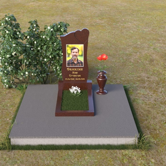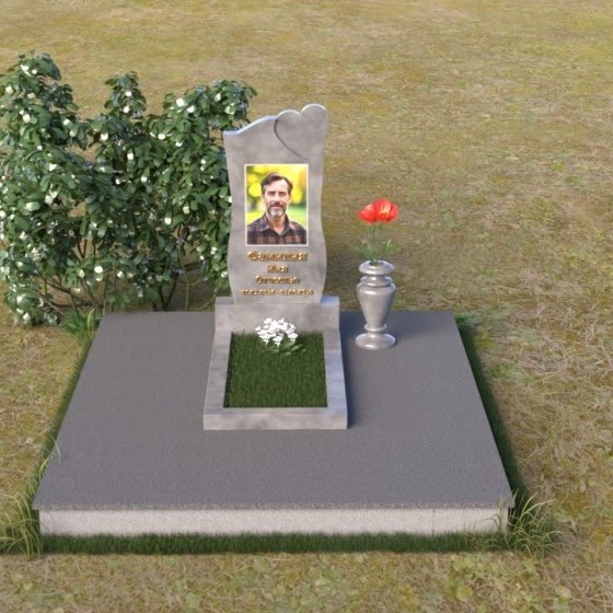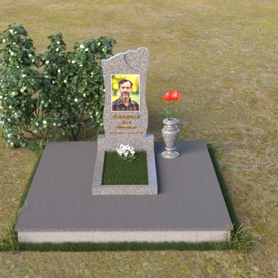 Особое внимание привлекает форма стелы. Ее верхняя часть плавно изгибается, образуя мягкую, устремленную ввысь дугу, словно застывшее мгновение молитвы. Этот плавный переход смягчает строгость камня, придавая ему нотки нежности и умиротворения. Грани стелы искусно обработаны, демонстрируя мастерство камнерезов. Зеркальная полировка основной поверхности контрастирует с матовой текстурой боковых сторон, создавая эффект глубины и объема. В верхней части стелы вырезано небольшое углубление в форме сердца, что добавляет композиции трогательности и символизма. Это сердце, словно наполненное любовью и светлыми воспоминаниями, будет хранить память о дорогом человеке.