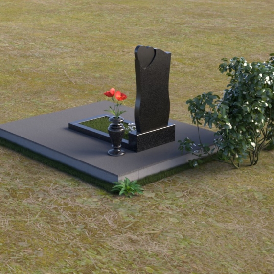 Дополнительным элементом композиции служит горизонтальная плита, выполненная из того же материала, что и стела. Она создает ощущение устойчивости и надежности, подчеркивая монументальность сооружения. На эту плиту можно возложить цветы или установить лампадку, чтобы почтить память усопшего. Рядом со стелой установлена небольшая ваза из черного гранита, предназначенная для живых цветов. Ее классическая форма и строгие линии гармонично дополняют общий стиль памятника.