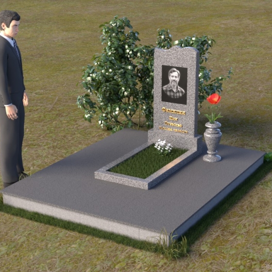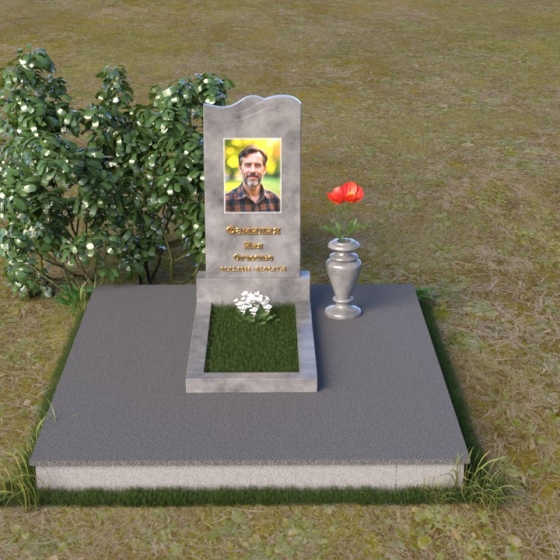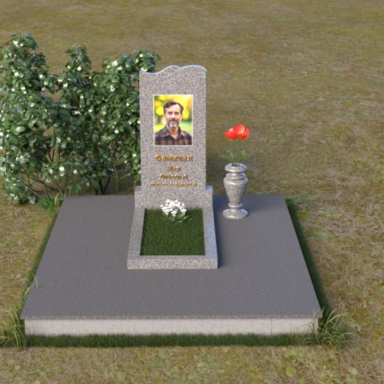 Этот гранитный монумент представляет собой вертикальную плиту с плавной, волнообразной линией верха, словно застывшая морская волна, несущая в себе покой и умиротворение. Боковые грани надгробного сооружения мягко скруглены, что придает ему изящный и завершенный вид. Верхняя часть памятника, обрамляющая портрет усопшего и памятную надпись, выполнена в строгом прямоугольном стиле, подчеркивая лаконичность и сдержанность дизайна. Нижняя часть памятника переходит в горизонтальную плиту, создавая единую композицию, гармонично вписывающуюся в окружающий ландшафт. Фаски по периметру обеих плит аккуратно сняты, что придает изделию дополнительную элегантность и законченность.