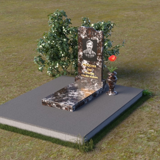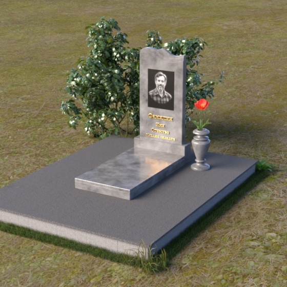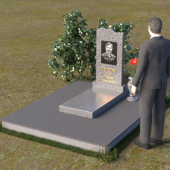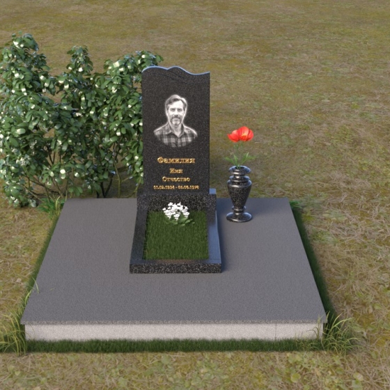 Надгробие начинается с массивного основания, выполненного в форме прямоугольной плиты. Его поверхность имеет матовую, слегка шероховатую фактуру, что создает контраст с глянцевыми элементами верхней части. На основании установлена горизонтальная плита, выполненная из полированного черного гранита. Зеркальная поверхность отражает небо и окружающий ландшафт, создавая ощущение глубины и простора. Вертикальная стела, расположенная в задней части композиции, является доминантой всего ансамбля. Ее верхняя часть имеет плавный, волнообразный изгиб, смягчающий строгие геометрические формы. На лицевой стороне стелы выгравирован портрет усопшего, а также имя, фамилия, отчество и даты жизни, выполненные золотистыми буквами. С правой стороны от стелы размещена небольшая гранитная ваза строгой формы, предназначенная для живых или искусственных цветов.