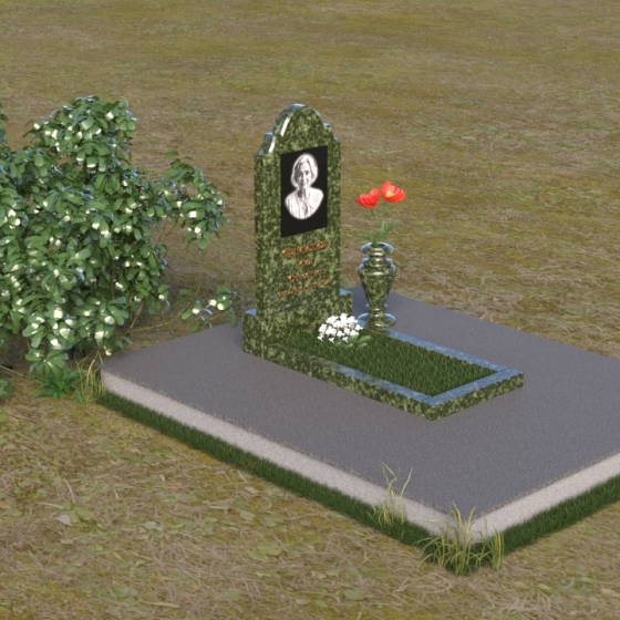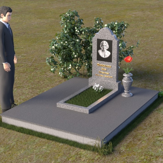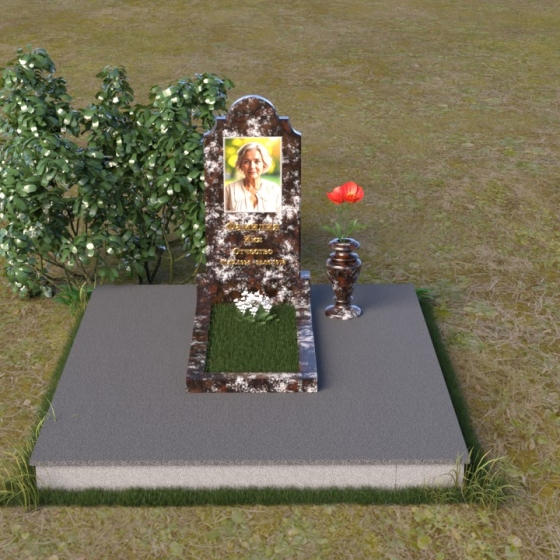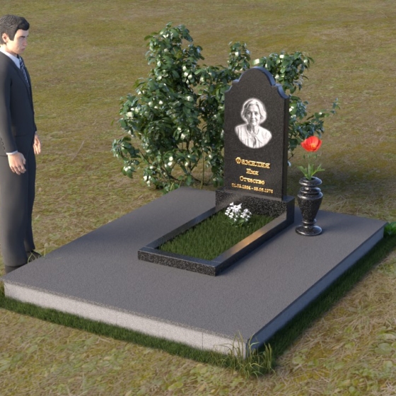 Мемориальная композиция ПВ 067 представляет собой вертикальную стелу, увенчанную плавной, изящной аркой. Верхняя часть стелы имеет аккуратно скругленные углы, что придает ей мягкость и утонченность. В верхней части стелы располагается овальный медальон с портретом. Нижняя часть стелы переходит в горизонтальную плиту, образуя единое целое. Плита имеет строгую прямоугольную форму с четкими гранями. Фаска по периметру плиты придает ей законченный вид и подчеркивает геометрию. Рядом со стелой установлена небольшая ваза из того же материала, выполненная в классическом стиле. Ее плавные линии и темный цвет гармонично сочетаются с основным элементом композиции.