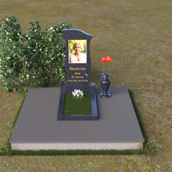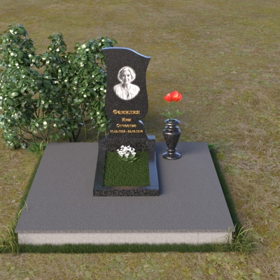 Памятник ПВ 088 представляет собой изящную стелу из черного гранита, чьи плавные линии словно стремятся ввысь. Верхняя часть стелы имеет волнообразную форму, с мягкими изгибами по бокам, что придает ей воздушность и легкость. Эти изгибы словно вторят жизненному пути, с его взлетами и падениями, радостями и печалями, но в конечном итоге приводят к умиротворению и вечному покою. На лицевой стороне стелы искусно выгравирован портрет усопшего, а также надпись с именем и датами жизни, выполненная золотыми буквами. Строгий, но элегантный шрифт добавляет памятнику благородства и сдержанности. Нижняя часть стелы переходит в прямоугольное основание, также выполненное из черного гранита, которое служит надежной опорой и придает памятнику устойчивость. Фаски на основании деликатно сглажены, что создает ощущение завершенности и гармонии. Дополнительно, рядом со стелой установлена небольшая ваза из того же черного гранита, предназначенная для живых цветов – символа неувядающей любви и памяти.