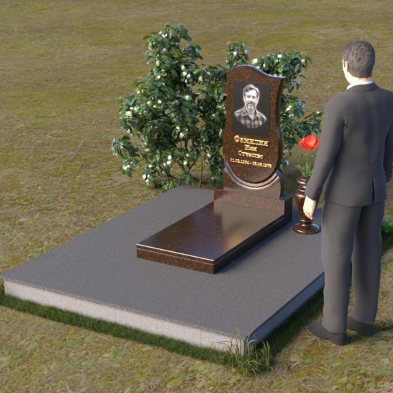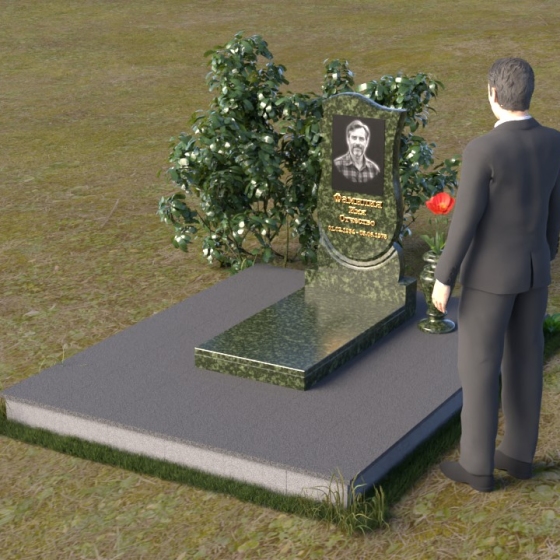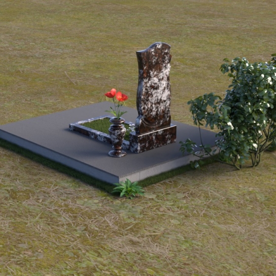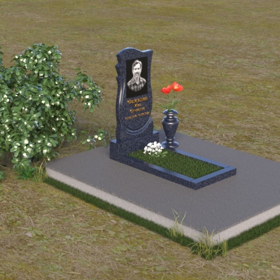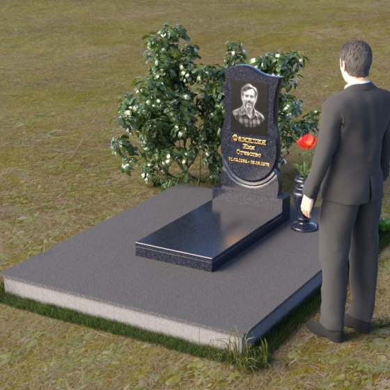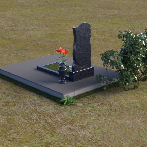 Основание под стелу выполнено в виде прямоугольной плиты с идеально отполированной поверхностью, отражающей небо и окружающий мир. Этот элемент добавляет композиции завершенность и создает ощущение прочности и долговечности. Рядом расположена дополнительная плита, также выполненная в черном цвете, которая служит местом для цветов или свечей, позволяя близким выразить свою любовь и скорбь.